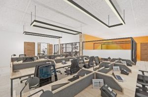 Call centre is designed to emphasize functionality, comfort and efficiency. With a minimalist design style , ergonomic furniture, efficient lighting and acoustic panels to reduce noise and distractions while promoting employes well-being and productivity. The overall is to provide practical and visually appealing environment that allows for efficient work space, better communication an performance.