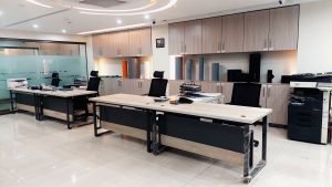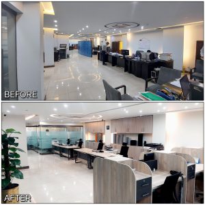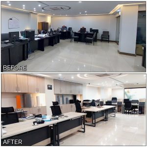 An interior based renovation project shaping it from classical towards new practical modern interior. The purpose was to add more practical space for the staff with adding new customize furniture, new colour and add new design elements to make it aesthetically attractive, modern and comfortable working space giving it a chic corporate office environment. Board and reception area also added to make it attractive for the clients.