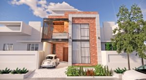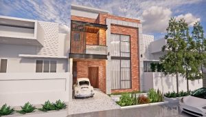 A compact house with a modern design combines industrial and natural elements for a striking and contemporary look Use of concrete and brick provides durability and low maintenance. The result is a stylish and efficient living space with a modern and inviting atmosphere.