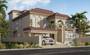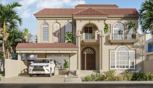 A luxurious 6 bedroom villa with a basement with traditional Spanish architectural design, featuring stucco walls, red clay tile roofs, and ornate details. The basement offers additional living space, and the interior design incorporates natural materials and intricate details for a elegant atmosphere.